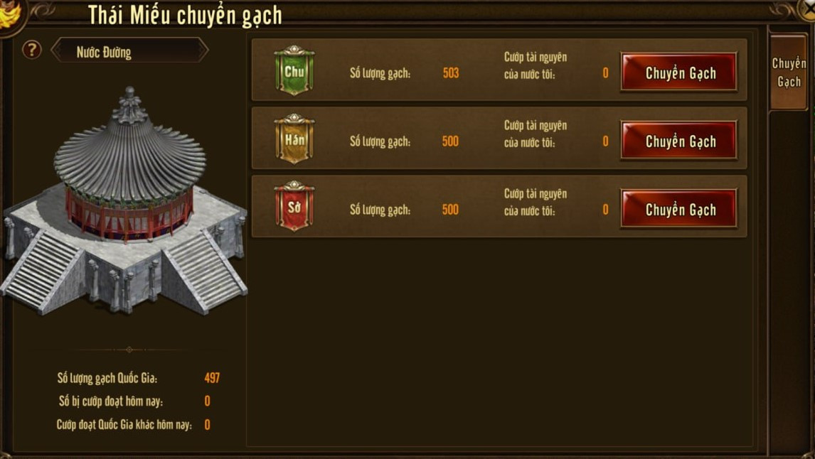 Một bí mật nho nhỏ là không chỉ chuyển gạch được nhận thưởng mà ngay cả cướp gạch thành công từ nước khác, các vị huynh tỷ cũng sẽ nhận được kinh nghiệm và công huân nữa đó nên huynh tỷ hãy cố hết sức để bảo vệ Thái Miếu nước mình và nếu có khả năng và bản lĩnh hãy "cướp đi đừng ngại".