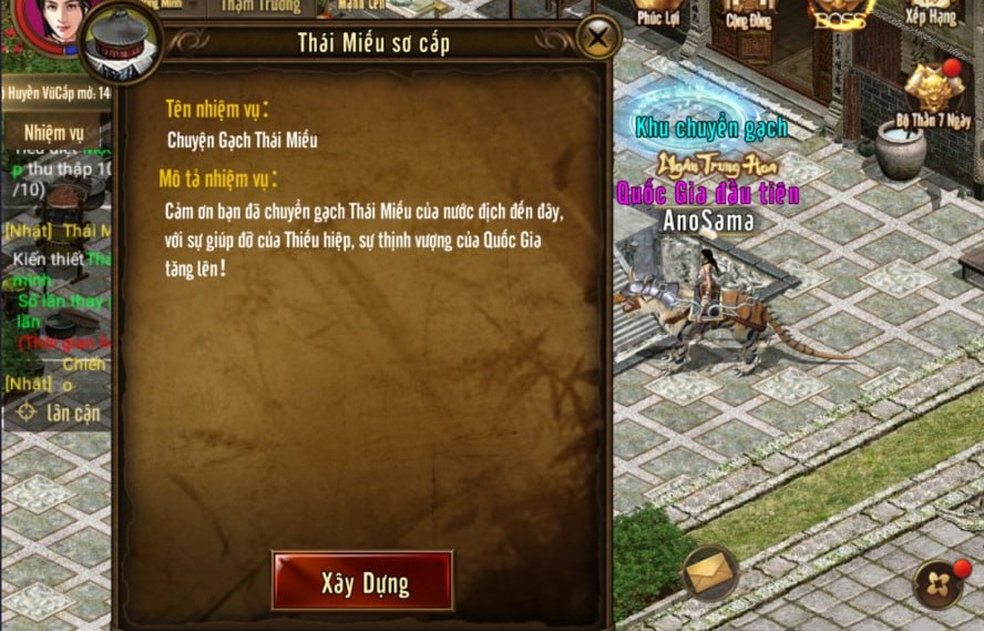 Một công việc cực kì thú vị mà huynh tỷ có thể gia nhập với vai trò của "thợ xây dựng" để tham gia vào việc "cướp" gạch từ Thái Miếu, và đó là cách gọi khác của nhiệm vụ "Chuyển gạch Thái Miếu".
