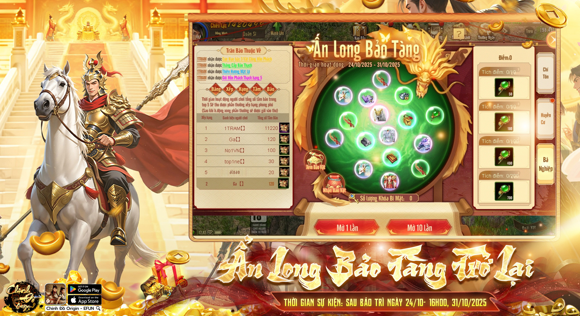 Huynh tỷ thân mến, giang hồ lại rộ tin đồn về một kho báu cổ bị phong ấn hàng trăm năm – Bảo Tàng Ẩn Long. Tương truyền, trong lòng đất sâu, ba đại kho báu Chí Tôn – Huyền Cơ – Bá Nghiệp đang đợi người hữu duyên khai mở, kẻ mạnh lĩnh thưởng, người may mắn rinh báu vật nghìn năm! 🐉