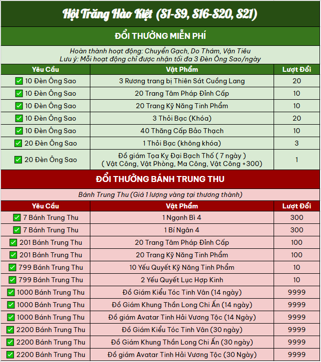 🍵 Đặc biệt, khi mua Bánh Trung Thu tại thương thành, huynh tỷ còn có thể đổi về những bí ngân, ngạnh bì, yếu quyết hiếm có, cùng loạt Đồ giám thần long – tinh vân – hải vương cực phẩm để khoe sắc trong mùa trăng.