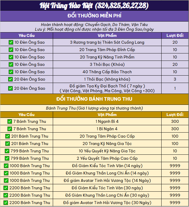 🎁 Chỉ cần hoàn thành nhiệm vụ Chuyển Gạch – Do Thám – Vận Tiêu, huynh tỷ sẽ nhận về Đèn ông sao rực rỡ ánh vàng. Gom thật nhiều đèn, huynh tỷ có thể đổi lấy Rương trang bị quý – Thăng Cấp Bảo Thạch – bạc khóa, bạc không khóa, thậm chí sở hữu cả Đồ giám tọa kỵ Đại Bạch Thố tung tăng dưới ánh trăng rằm.