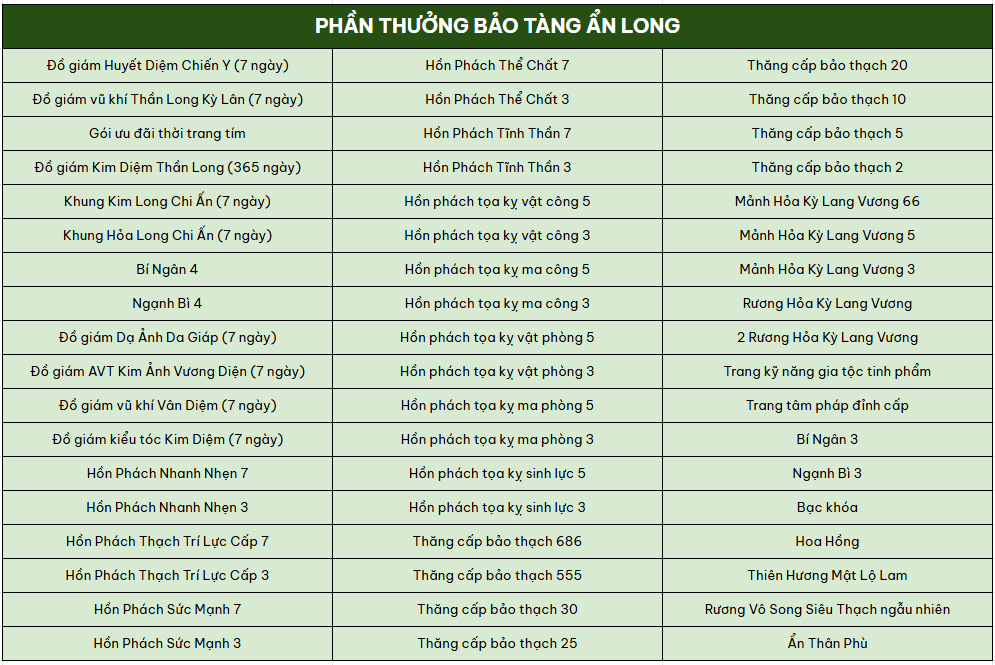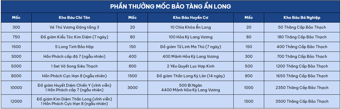 Cách thức tham gia: Sử dụng Chìa Khóa Ẩn Long để kích hoạt kho báu và nhận thưởng. Cứ mỗi cột mốc mở rương, nhân sĩ sẽ nhận thêm thưởng mốc giá trị.